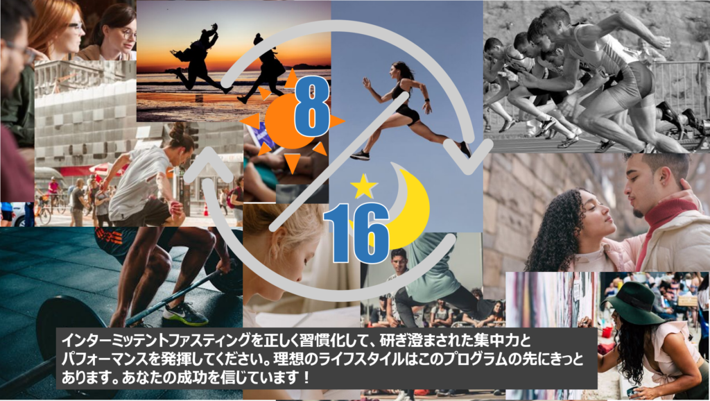 どんなライフスタイルの方でもピッタリ合うように、科学的な知見に基づいてつくられたサプリメントを飲みながら16:8のIFを実践するというシンプルなものです。